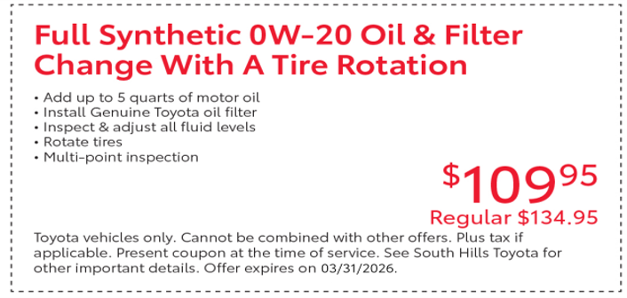 South Hills Toyota 0W-20 Oil & Filter Change with Tire Rotation
